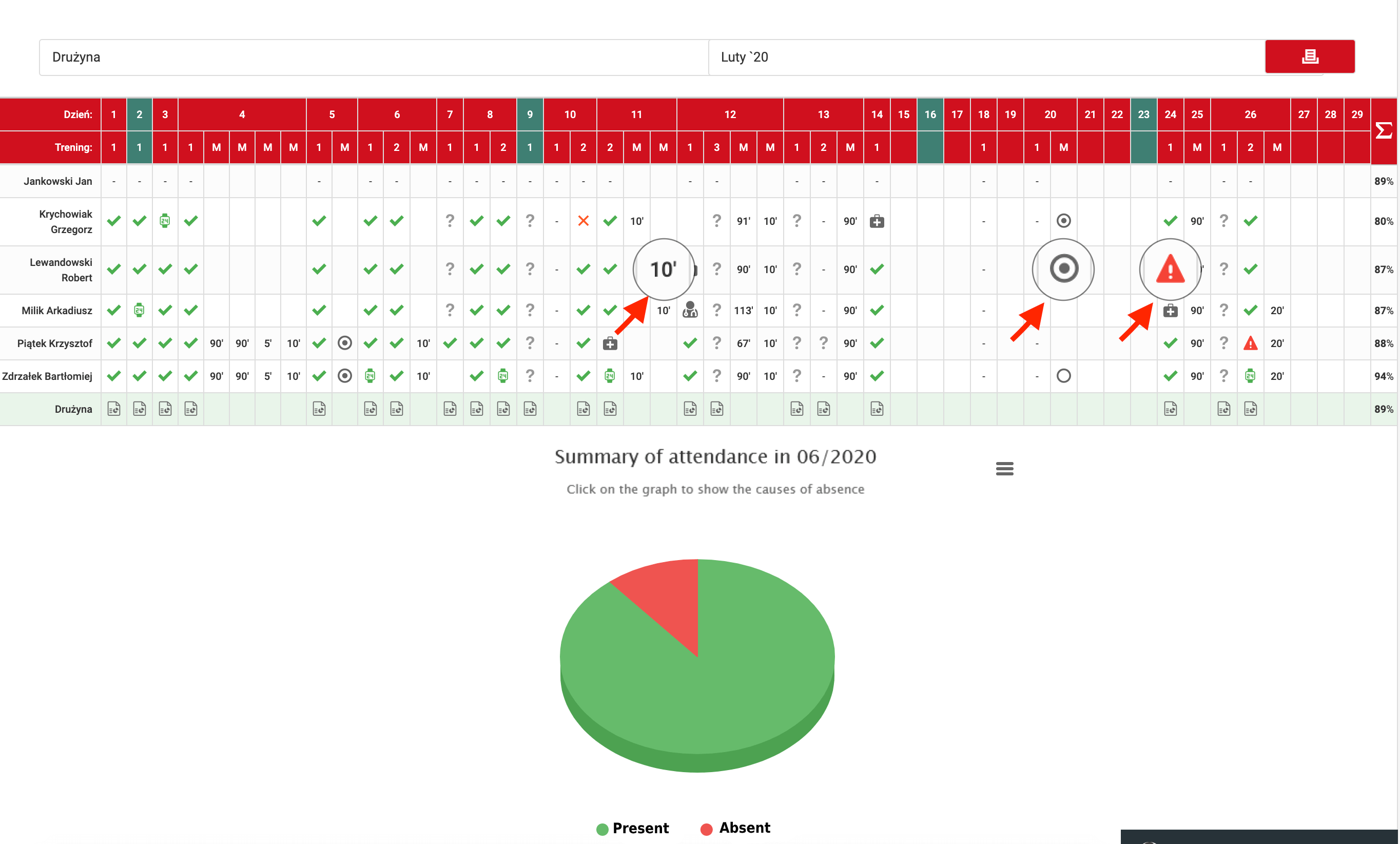 Pod tabulkou je výsečový graf zobrazující docházku pro vybraný rozsah dat ve zvoleném měsíci. Stojí za zmínku, že tento graf je interaktivní. Když kliknete na červenou oblast, graf zobrazí podrobné údaje o důvodech nepřítomnosti na trénincích.