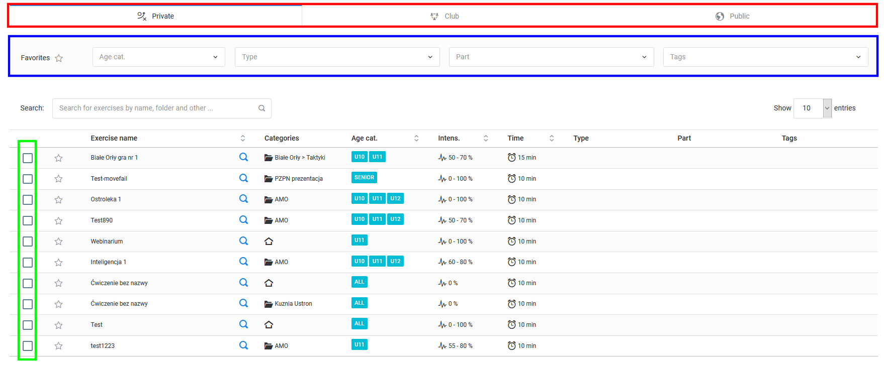 Das Fenster zum Hinzufügen von Übungen besteht aus vier Hauptelementen. Das erste (rot) ist die Liste der verfügbaren Bibliotheken. Je nach Ihrer Lizenz können es zwei, drei oder sogar vier Bibliotheken sein. Ein weiteres Element (blau) sind die Filter, mit denen Sie die gewünschte Übung finden können. Das nächste Element (grün) sind die Kontrollkästchen, die Sie auswählen, um Übungen zum Entwurf hinzuzufügen. Der verbleibende Bereich ist eine Liste der verfügbaren Übungen mit ihren Parametern.