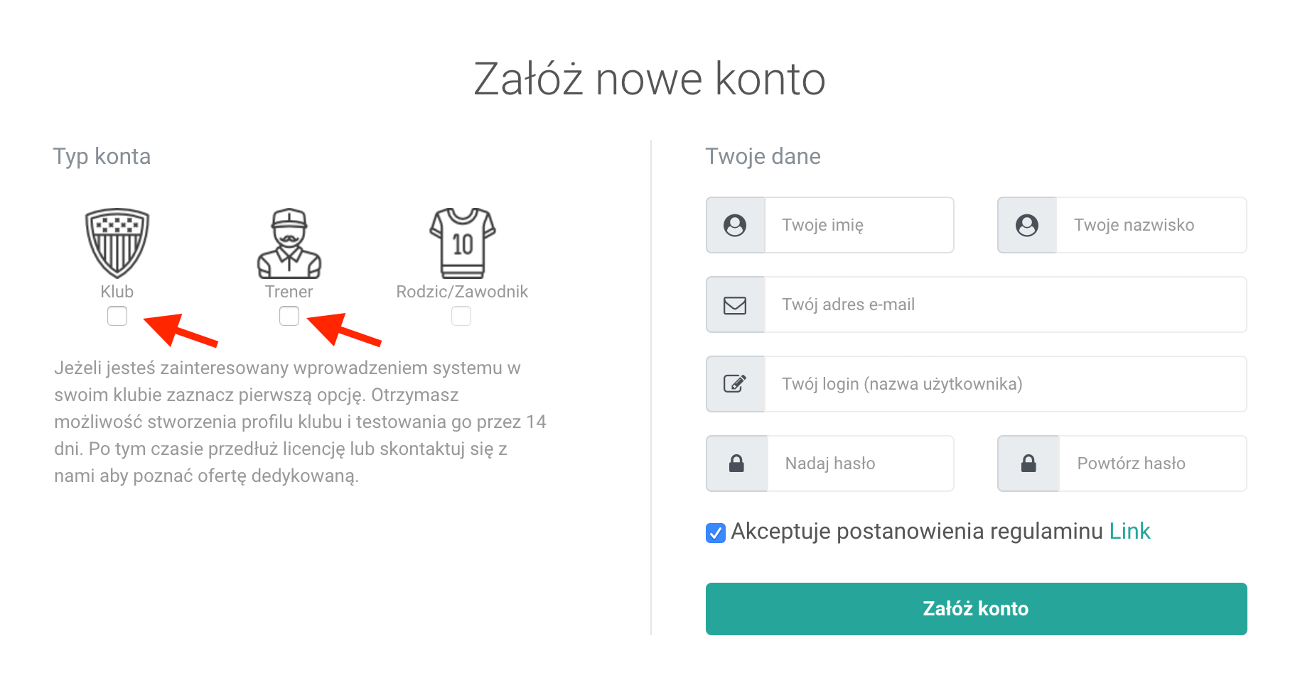 Aby założyć konto w systemie ProTrainUp, wpisz w przeglądarkę adres protrainup.com. Następnie w górnym menu kliknij w zakładkę "załóż konto". Następnie wybierz typ konta, który chcesz utworzyć. Do wyboru masz konto Trener indywidualne lub Klub - licencja klubowa. Konta rodziców i zawodników zawsze tworzone są przez trenerów lub koordynatorów.